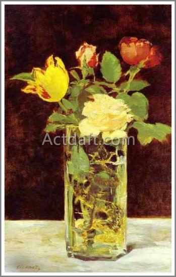 マネ【花瓶のローズとチューリップ】 1832年パリ生まれのエドゥワール・マネ。印象派の先駆的画家。パリの日常を主題にすることが多く、明るい色調、生き生きとした筆のタッチで描かれた作品が多い。この作品も、そのうちのひとつ。